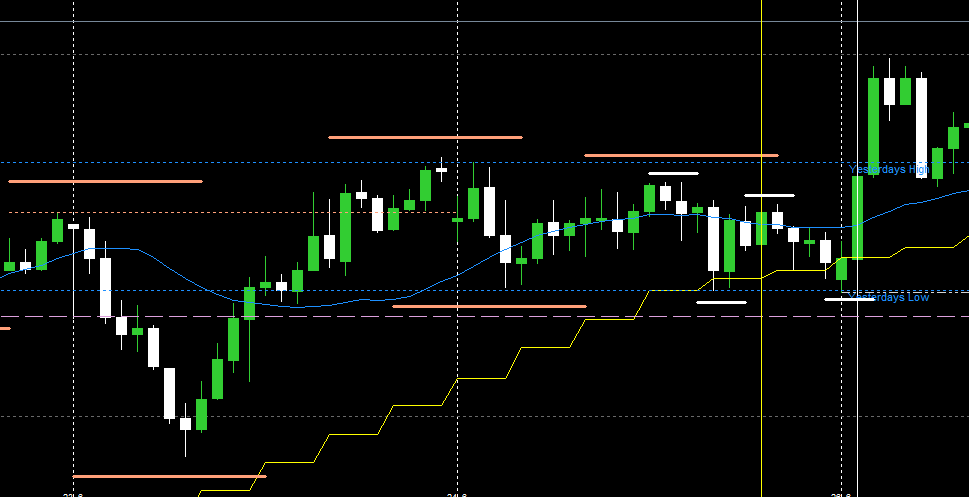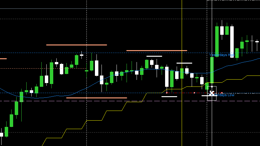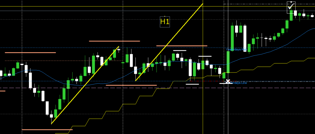 黄色垂直線が下長ヒゲをつけたH4ローソク足が確定したH1足。