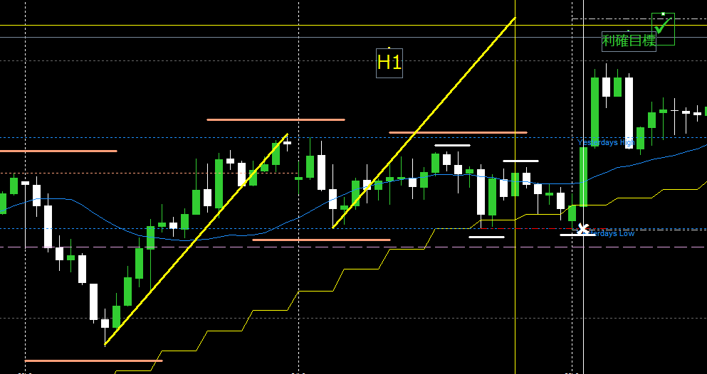 週またぎでH1波の上昇転換チャートパターンを待っていると、白垂直線で「H1波の安値切り上げ・高値更新(WT)」が確定した。なので、ここでエントリー。