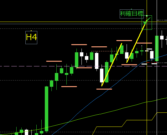 現在、過去からの最高値をどんどん更新している状態で、週足で見ても目標となる高値が見当たらなかったので、H4波第1波のN値の少し下(黄色水平線)を利確目標とした。