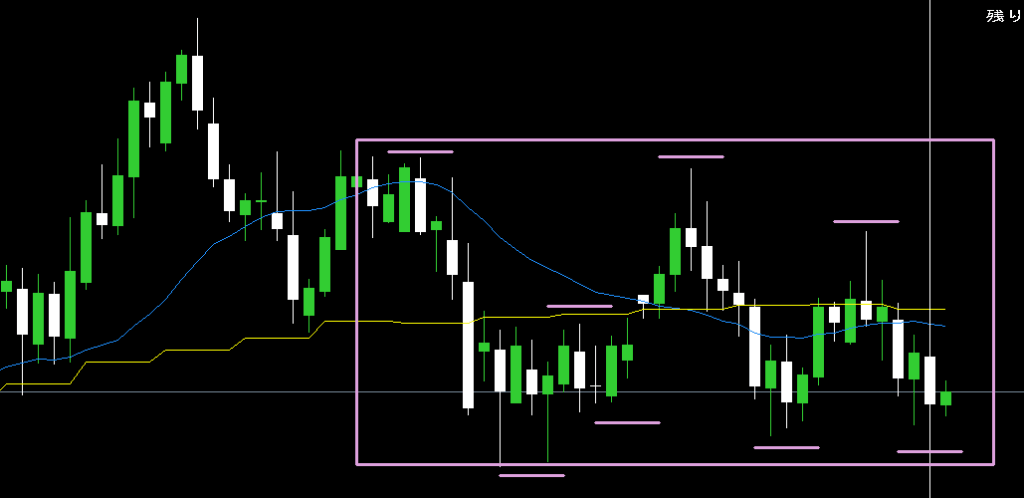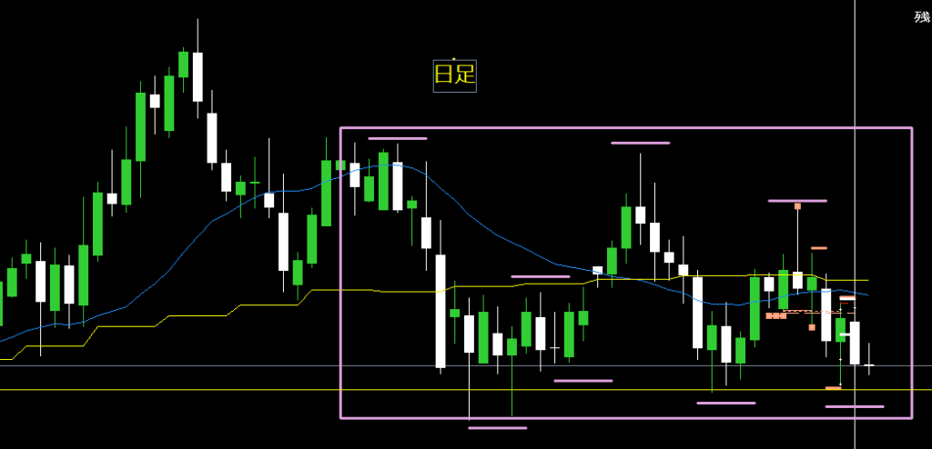 日足は大きなレンジ内で上下している感じ。