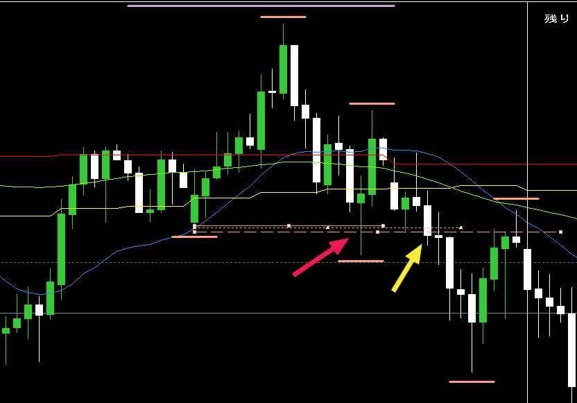 利確目標は日足がレンジのような感じで推移していたので、日足波の前回安値の少し上(黄色水平線)。