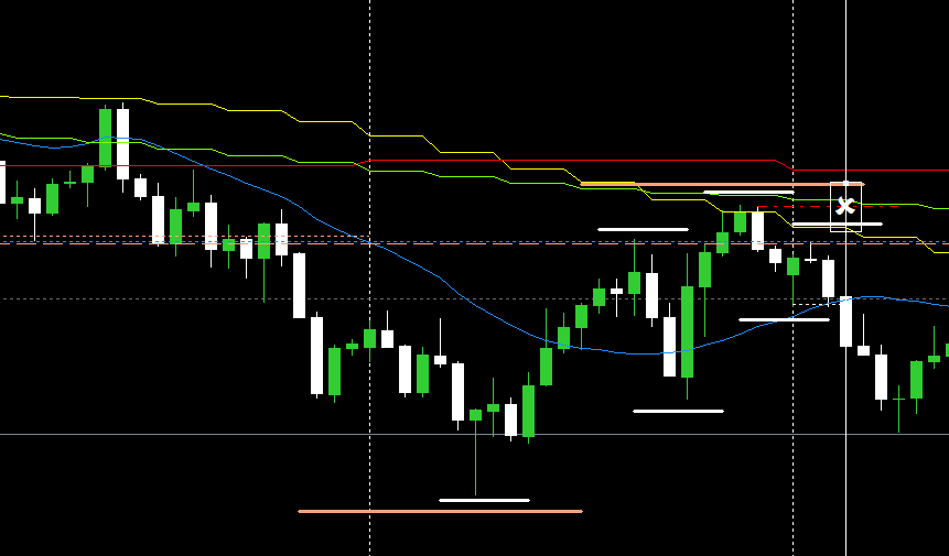 戻りを持っていると、H4レジサポライン(オレンジ破線)までレートが上昇してきて、加えてH4MAに跳ね返される形になった。