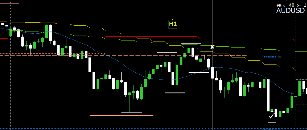 H1波が上昇トレンドを作ってH4レジサポライン(オレンジ破線)まで到達したのもいい流れ。