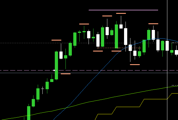 更新幅が小さかったが、日足調整波内で日足レジサポライン(紫破線)(日足実体最高値)辺りまでの値幅を狙う。
