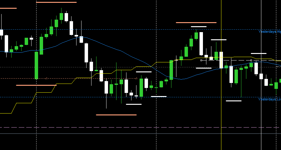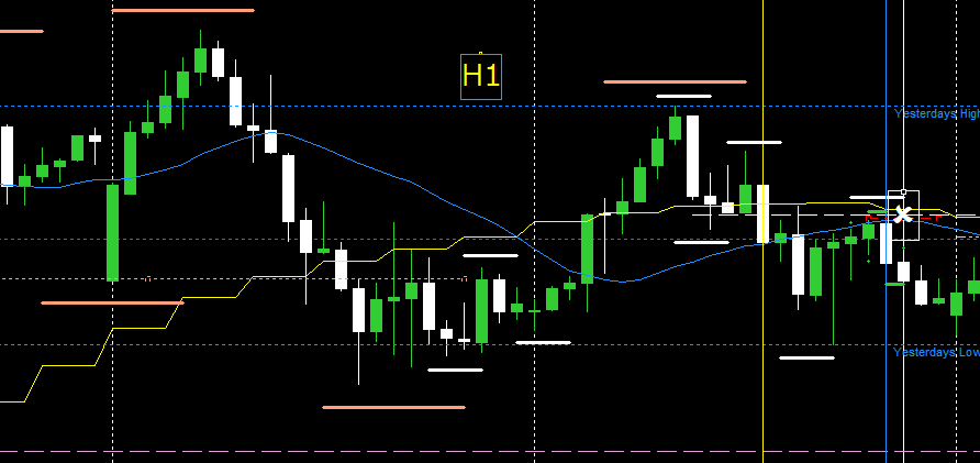 4時間足は押し安値(オレンジ点線)とH4MAを下抜いてきて、H4レベルの上昇トレンドを崩し下目線になった。そこからH4MAを上抜けするほどの深い戻しをつけているところ。