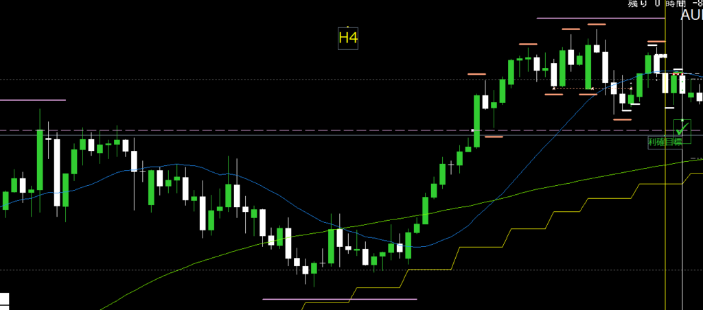 利確目標は、4時間足チャートで見える日足のレジサポライン(紫破線)(日足で見える実体最高値)の辺り。