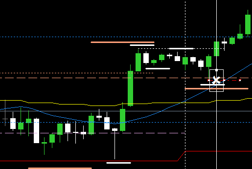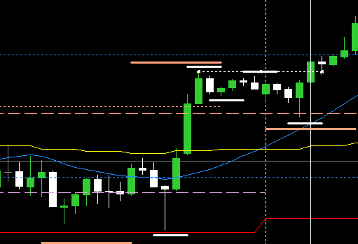 しばらく監視していると、H4直近高値(白点線)をH1足が上抜け確定した。H4ダウ更新確定とみなしてここでエントリー。
