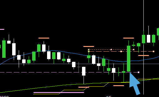 4時間足は「日足レジサポライン」と「日足MA」に到達して跳ね返されて、青矢印のところで「長い下ヒゲをつけたコマ足陽線」からの「包み足」が発生。