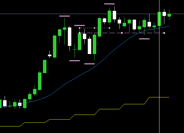 日足は日足戻り高値(紫点線)を上抜けした後に、日足レジサポライン(紫破線)まで戻ってきてから再び上昇を開始しているところ。