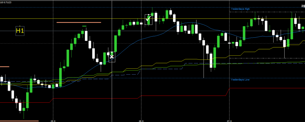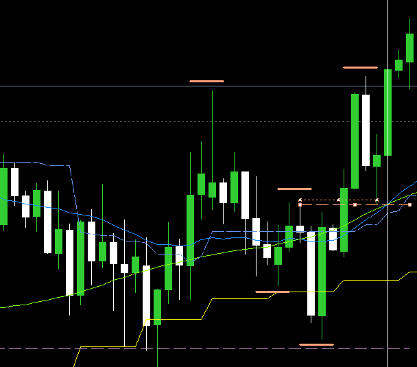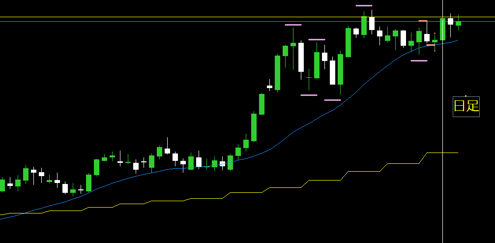 なので、利確は日足直近高値の実体部分(黄色水平線)に設置。