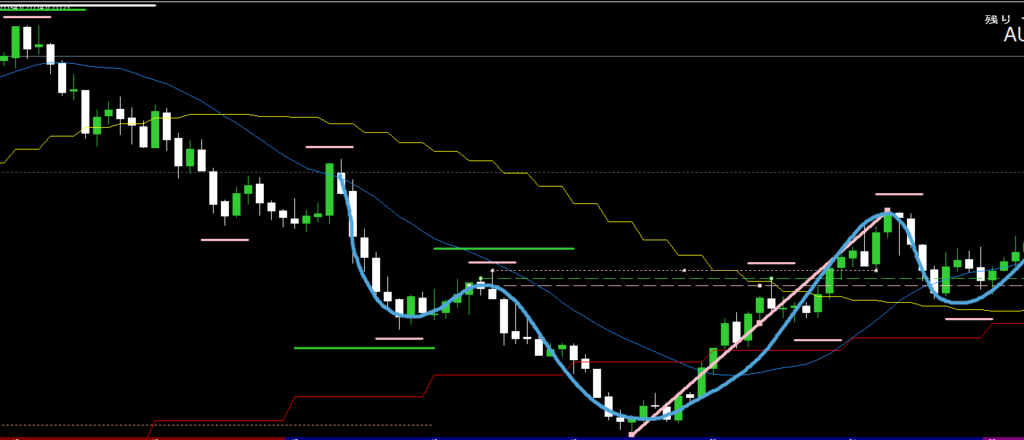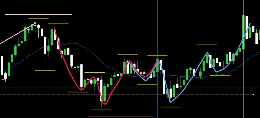 M5戻り高値を抜けたピンク太線をひとつの波としてとらえると、M5レベルのレジサポ逆三尊(青線の波)の形になる。