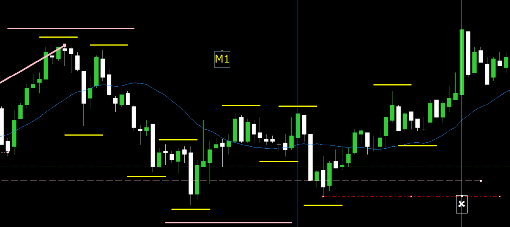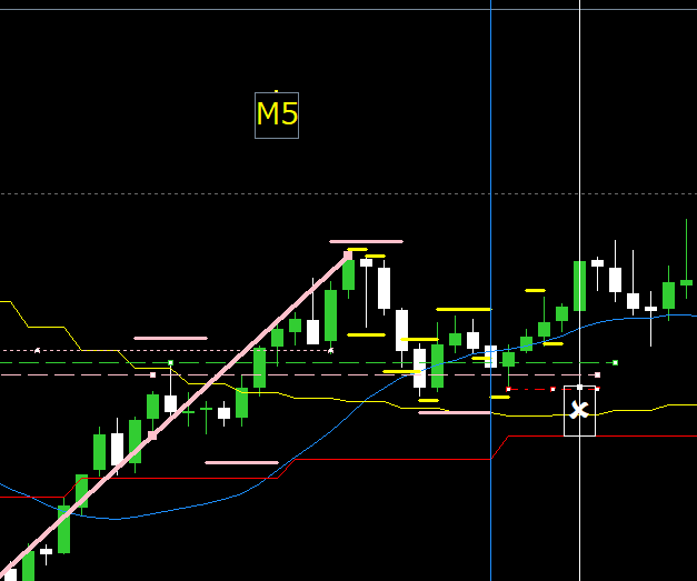その後、再び青線のような形でM1レベルの右肩上がり逆三尊を形成してきて、白垂直線の所で完成したので、ここでエントリー。