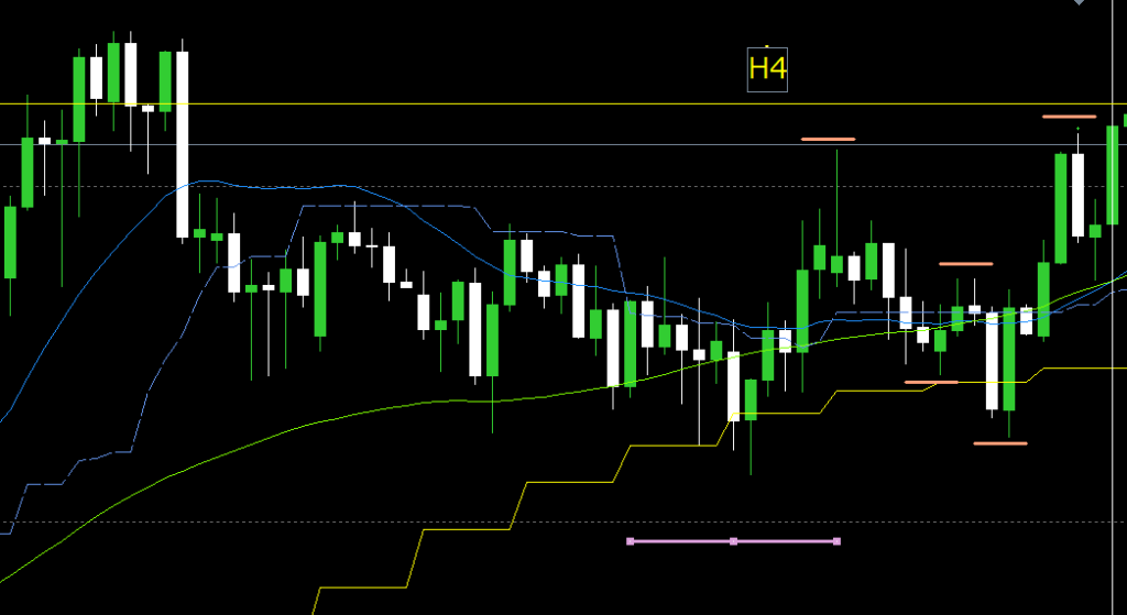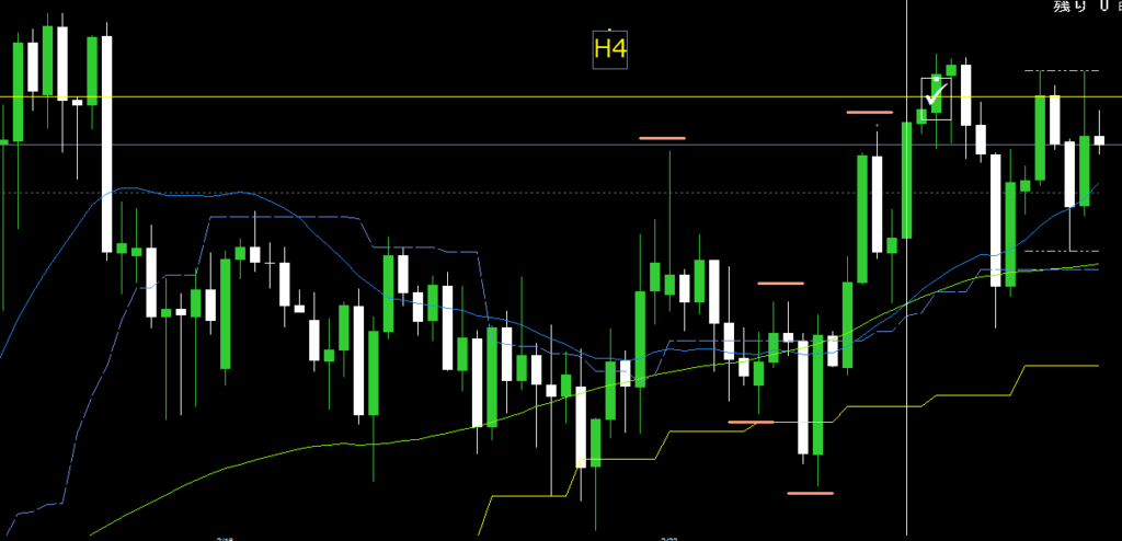 4時間足は戻り高値(オレンジ点線)とH4MAを上抜けして上目線になってから、H4レジサポライン(オレンジ破線)まで戻ってきたところ。