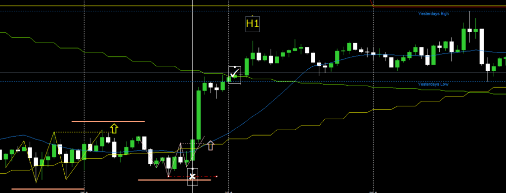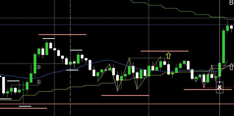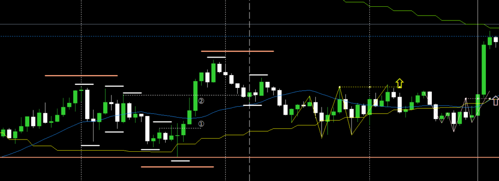 その後、ピンク矢印の所で逆三尊(ネックライン実体更新)+H1MA・H4MA上抜け確定の形ができたのでここでエントリー。