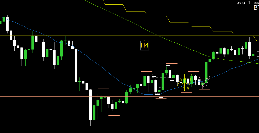 黄色矢印辺りでH1WB成立+H1MA・H4MA上抜け確定の形ができたように見えるが、ネックライン(黄色点線)を実体更新したWBではないのでここではエントリーしない。
