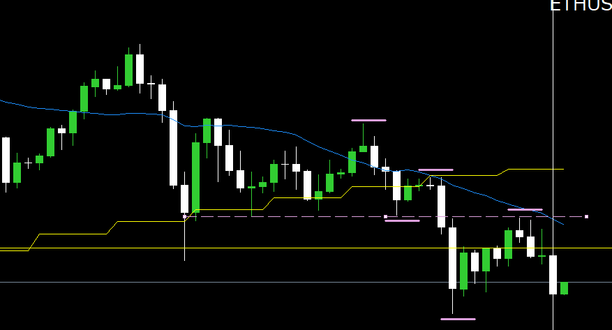 「高値切り下げ・安値更新(WT)」を確定する陰線が確定した瞬間を見逃してしまっていたので、次足の少し戻してきた所(白下矢印)でエントリー