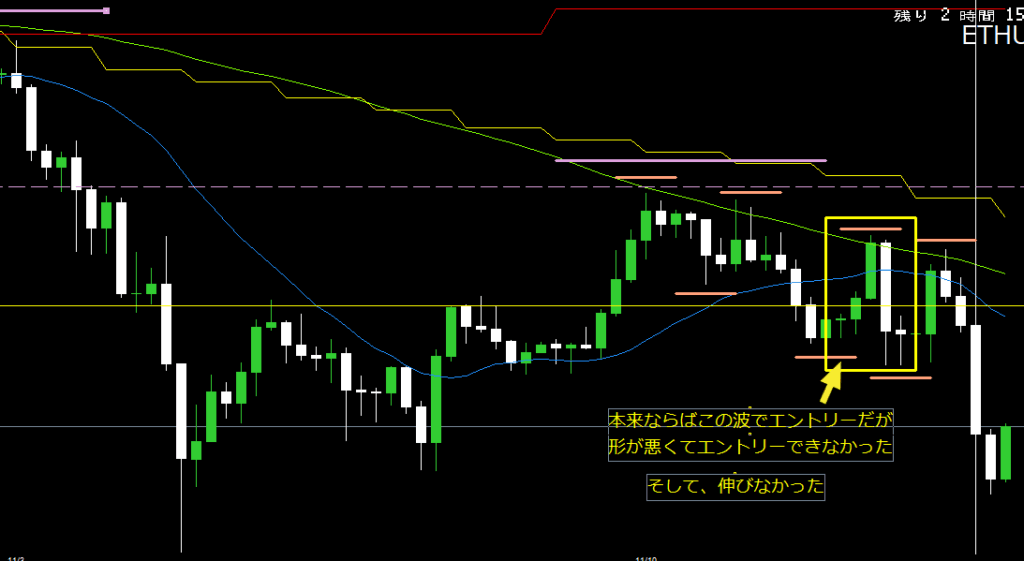 エントリーした波のひとつ前の波(黄色枠)がH4MAとH1MAがデッドクロス(1時間足チャートで確認)した直後の初戻し1波だったが、形的にエントリーができないパターン(ここで確認)で、なおかつその1波が伸びていなかった