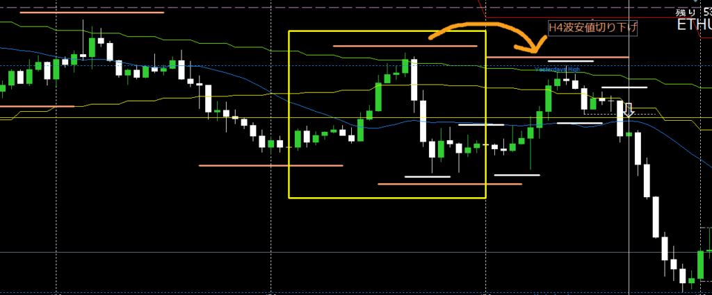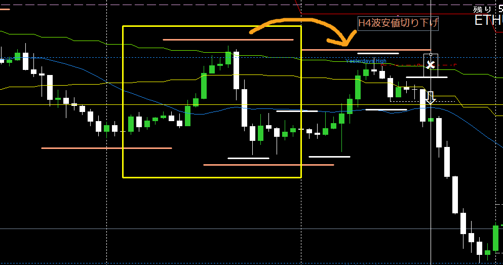 H4MAとH1MAがデッドクロスした直後の、エントリーできない形(詳しくはここで解説)で伸びがない1波(黄色枠)の後に、4時間波安値切り下げポイントで1時間波の「高値切り下げ・安値更新(WT)」が完成した所がエントリーポイント