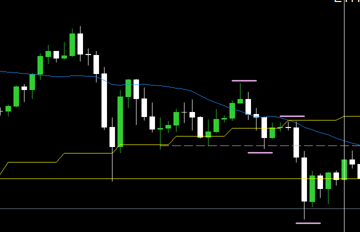 4時間足波で「戻り高値更新+H4MA上抜け確定」の形が出たのでロングを狙いたいのだが、日足の戻り売り勢力がいるライン(紫破線)に近づいていっている局面なので取れてもそのラインまで
