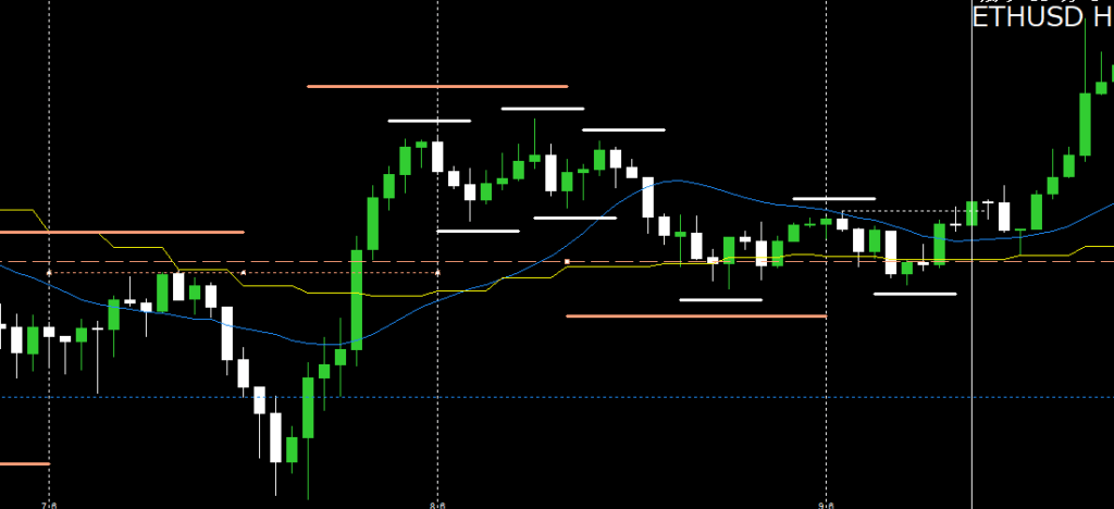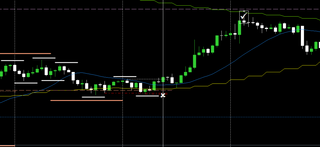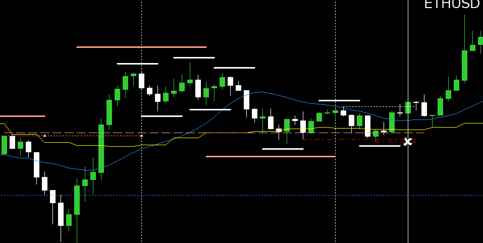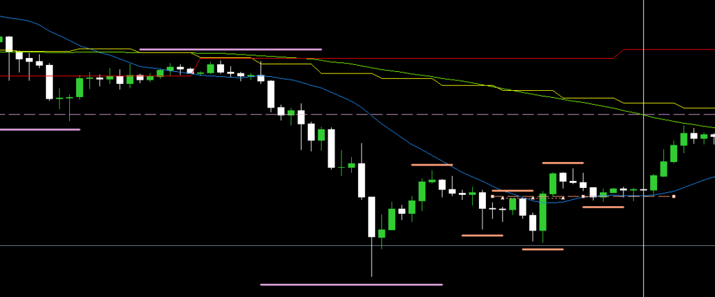 1時間足波の下降トレンドを作ってH4押し目買いラインまで戻ってきて、白垂直線の所で1時間足の「安値切り上げ・高値更新(WB)」の形が完成したので、ここでエントリー