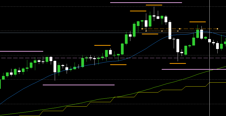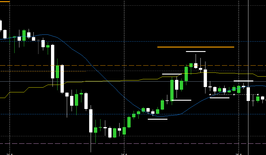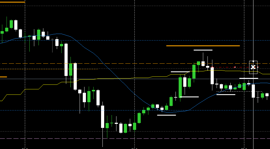 4時間足は押し安値(オレンジ点線)とH4MAを下抜けして下目線になり、H4レジサポライン(オレンジ破線)まで戻ってきた。