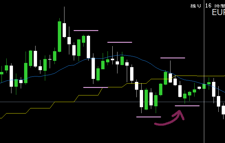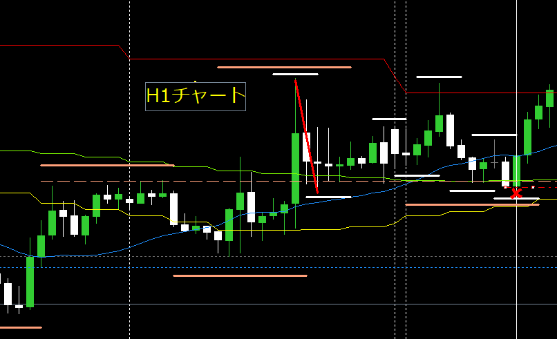 H4の戻しの目安は、H4ローソク足陰線2本(以上)の確定だが、今回の場合は長い時間横ばいで推移していたので、横ばい終盤でのH1下降トレンド発生がエントリータイミングをはかるきっかけになった