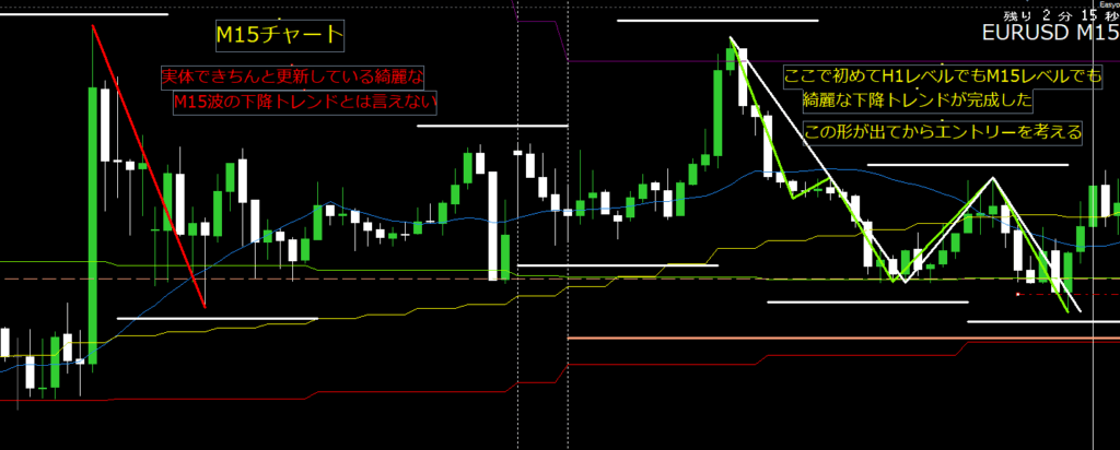 押し目買いのポイントまで戻ってきた1回目(赤線)では1時間足レベルの下降トレンドを作って到達していない。なので、15分足波の実体できちんと更新している綺麗な下降トレンドが出ていればそれを基準にエントリーしたいところだが、15分足チャートを見てみても綺麗な実体更新のM15波下降トレンドができていない。