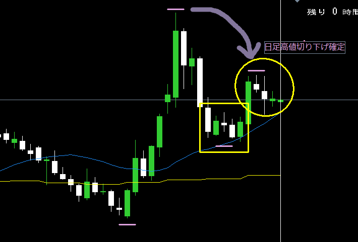 黄色丸内で4時間足レベルの「押し安値下抜け」と「H4MA下抜け」が確定した(4時間足の項目を参照)ので、日足の高値切り下げが確定した。