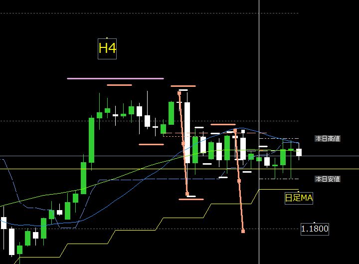 H4波の第3波なので「H4波第1波のN値(1.1800のキリ番もその辺りにあった)」、N値まで伸びなくても「日足MA」くらいまでは伸びてほしい所だが、1時間足で3回も止められている(青枠)ライン(黄色水平線)がすぐ下に控えていた。