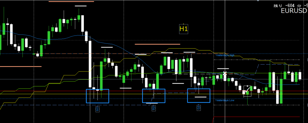 エントリー後は下降していってくれたが、H1波が3回も反発している黄色ラインで、長い下ヒゲをつけた1時間足陽線が確定。