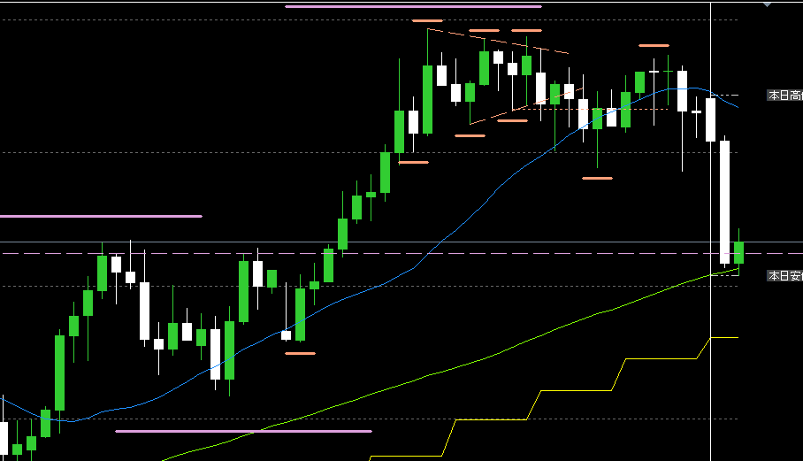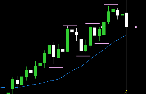 調整の動きをして日足レジサポライン(紫破線)まで下降しそうなところ。