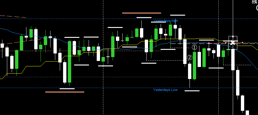 日足トレンドと同じ方向へのエントリーを狙っていて「H1左安値W抜け」が出たらここでエントリーするのだが、今回は日足トレンドとは反対方向へのエントリーを狙っているのでここはスルー。