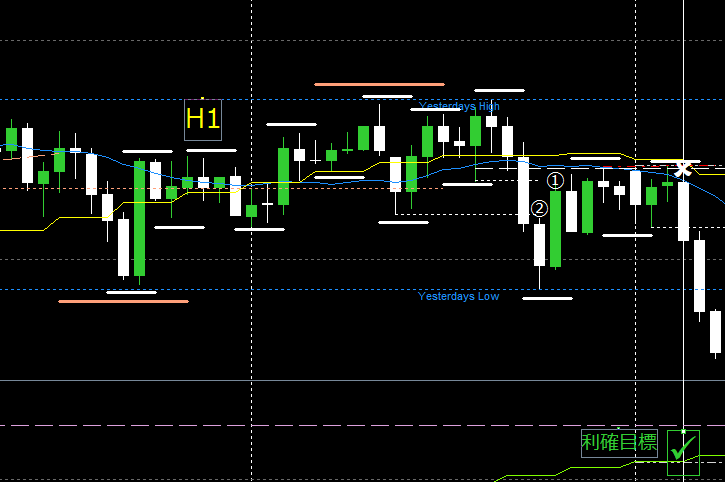 1時間足は上昇トレンドを作って上昇してきて、H4波直近高値手前で「H1左安値W抜け(白点線①と②の安値)」の転換チャートパターンを作ってきた。