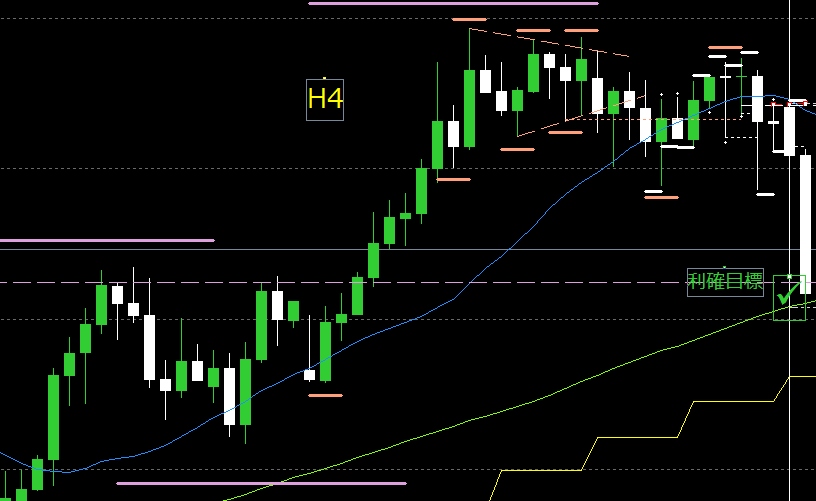 H4の80MAに到達する少し手前で反転上昇していくことがよくあるので、H4の80MAの少し手前で利確。