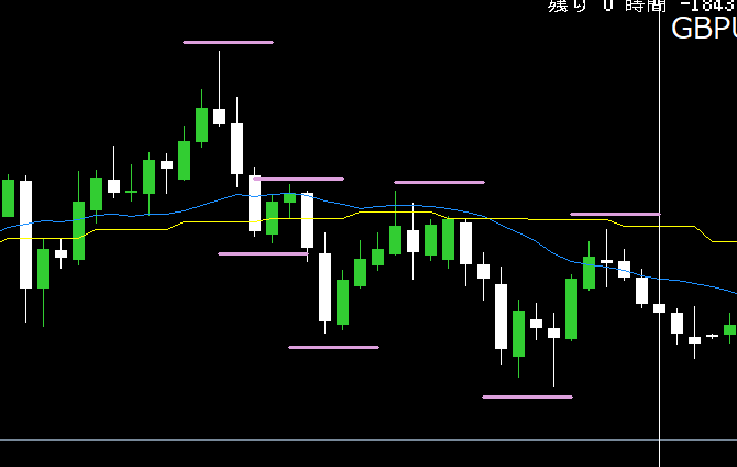 今回は、H4戻り(調整)内でのH1波上昇トレンドが形成されなかったので、損切は4時間波の直近高値(1時間足の直近高値でもある)の少し上に設置