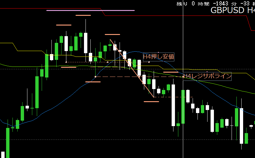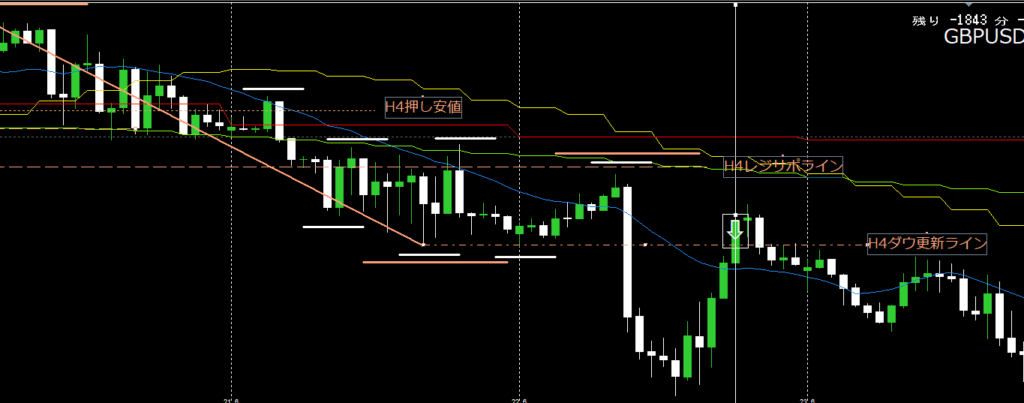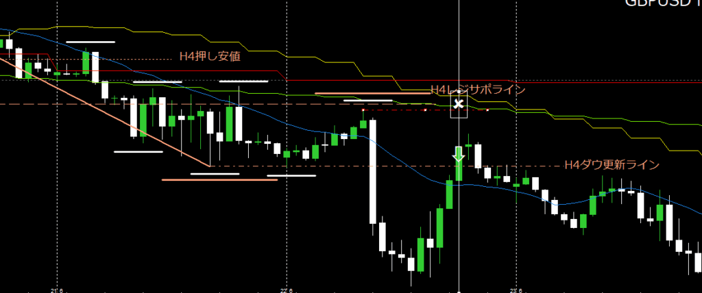 通常であれば、トレンド転換した後のH4の戻り1波内で「1時間足波上昇トレンドの形成+H4レジサポライン到達(レジサポライン付近まで到達)」を待って、それを基準にエントリーするところだが、今回はH4陽線2本の戻りでH4レジサポライン付近(オレンジ破線)まで到達したがH1上昇トレンドは形成しないまま、そこから勢いよく下降し、H4波の安値を更新(H4ダウ更新)していってしまった。かなり大きな1時間足陰線で確定したのでエントリーチャンスなし。