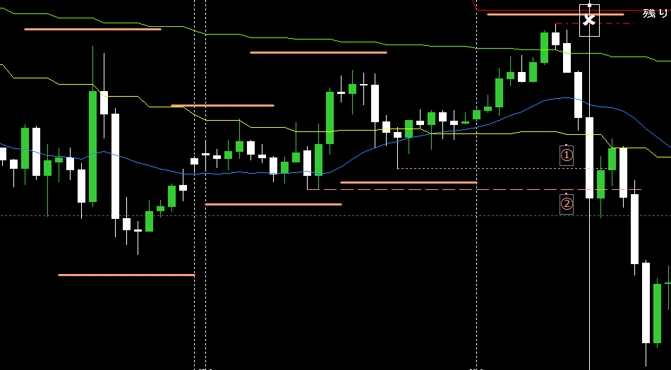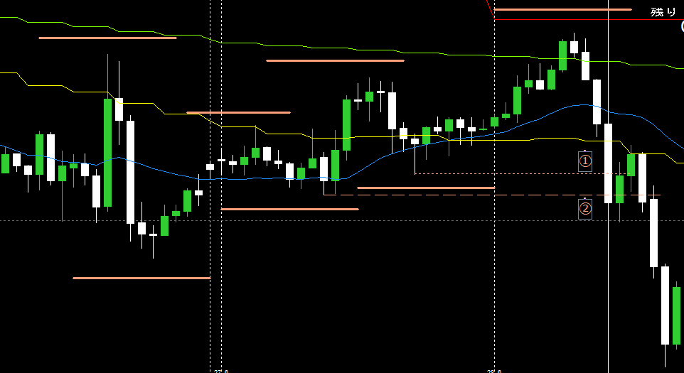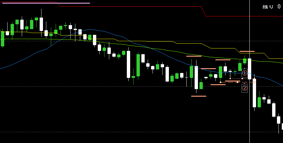 更にそのままの勢いでもう一つ下のH4安値(オレンジ破線)(②)も割ってきた