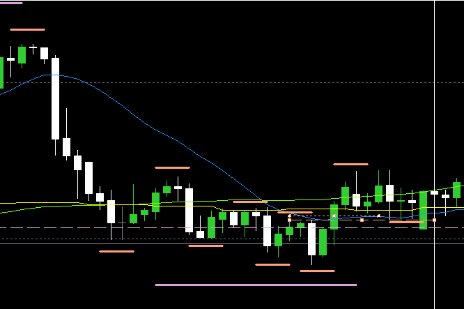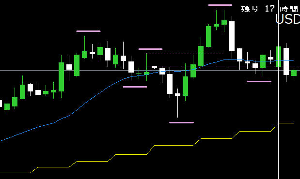 日足押し目買い勢力がいるライン(レジサポライン)(紫点線)まで押してきている