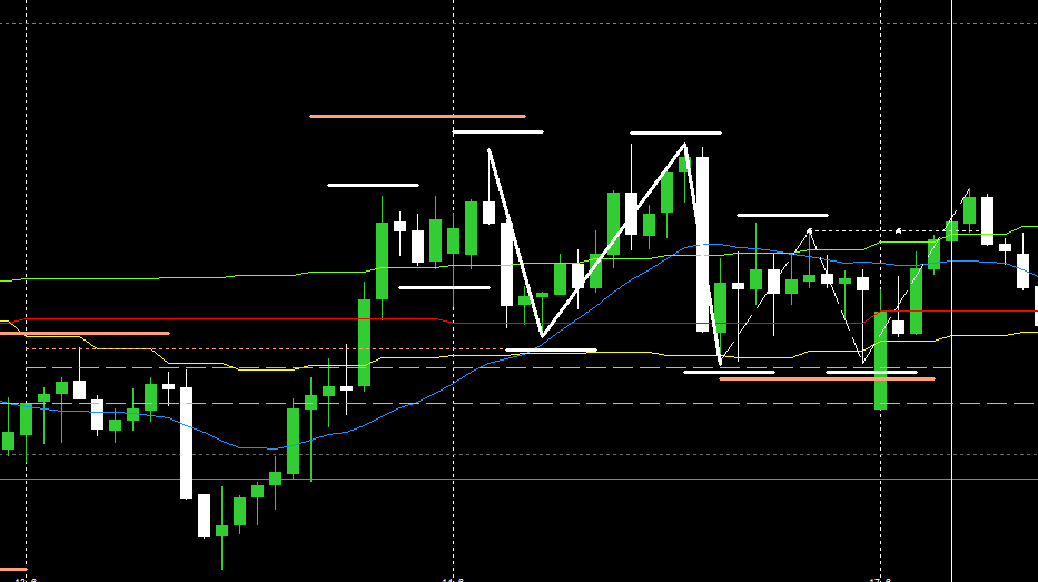 4時間足はH4下降トレンドの戻り高値(オレンジ点線)を上抜けして、H4レジサポラインまで押してきた所。