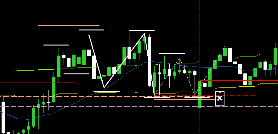 H4調整波内でH1波の高値が揃っているが、白線のNで下降トレンドを形成している。その後の白破線をH1の安値切り上げ高値更新とみなして(週の始まりの窓開け大陽線は無視する)、ここでエントリー。
