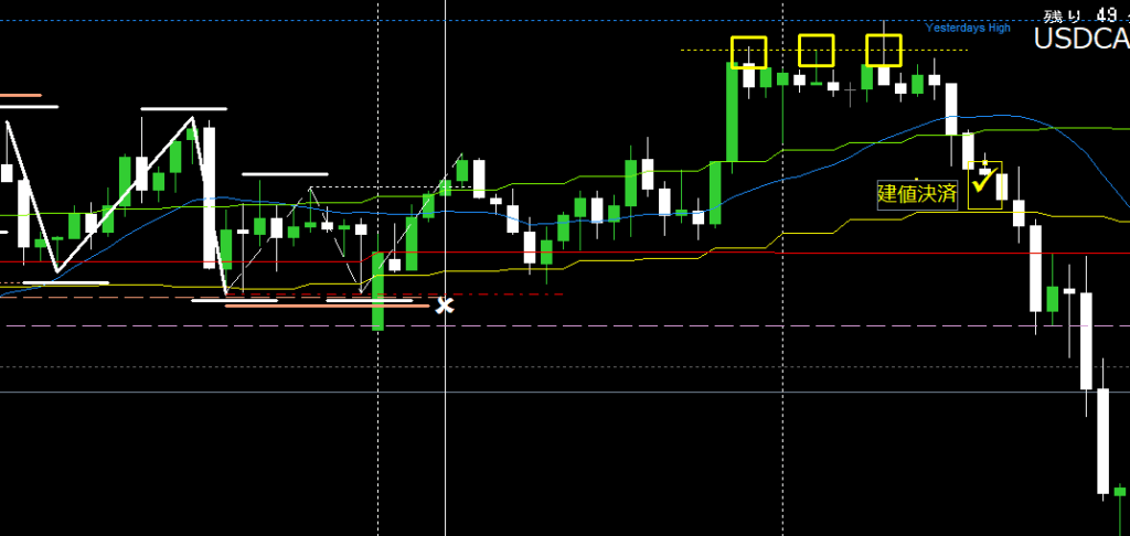 H1チャートの黄色枠3点で上を押さえられた時点で「怪しい」と思ってロットの半分でも決済しておくべきだった。