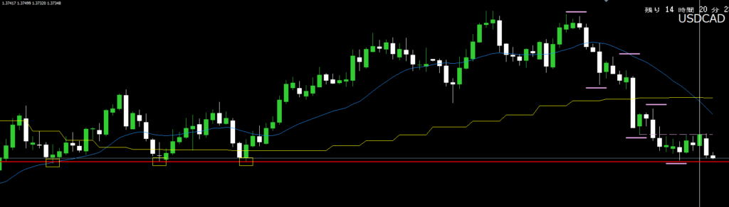 強い勢いで下降してきているが、過去に三回も止められている(黄色枠)ライン(赤水平線)に到達したので、ここから日足レジサポライン(紫破線)までは上昇するだろうと予想して、日足には逆張りになるが4時間波順張りのエントリーを狙った。