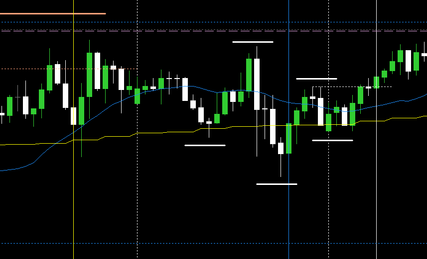 青垂直線がH4の下長ヒゲをつけた陰線が確定したH1ローソク足。