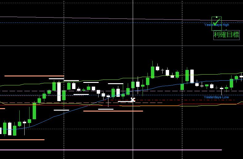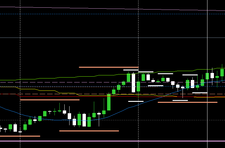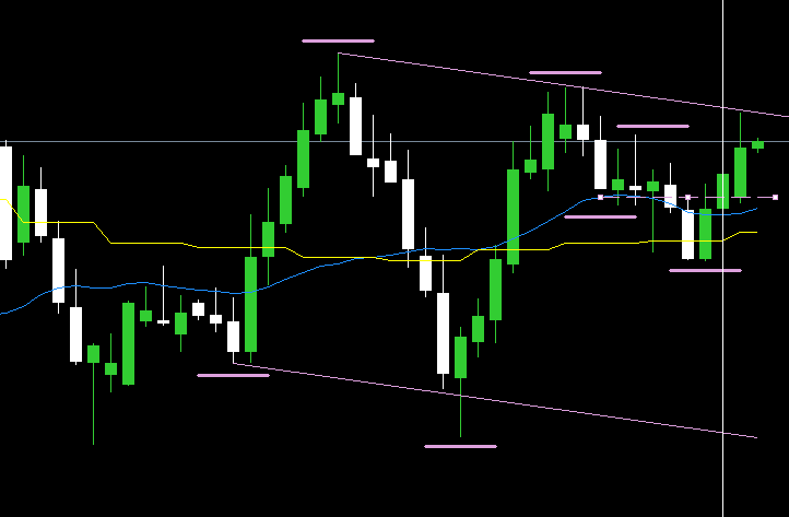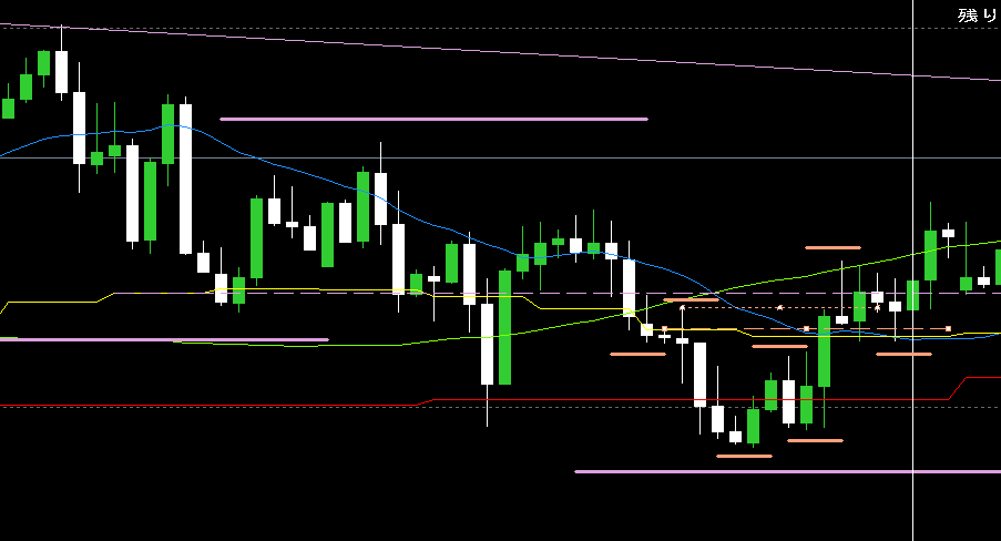 ロングしたのだが、日足レジサポライン(紫破線)が気になった。