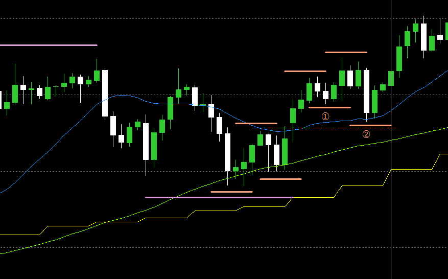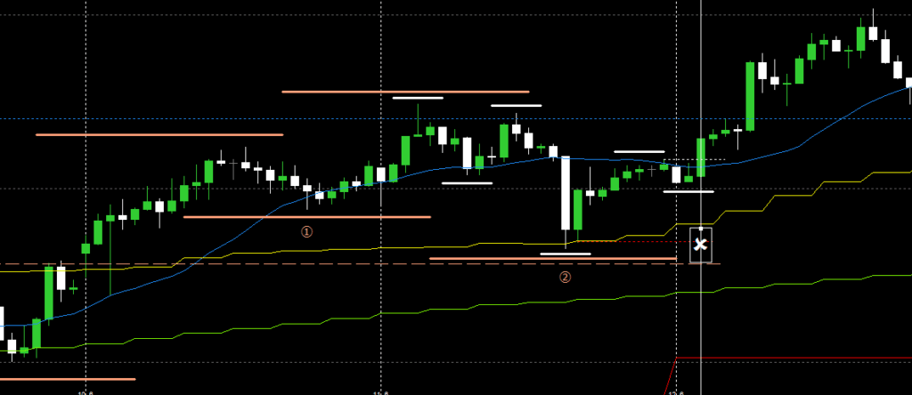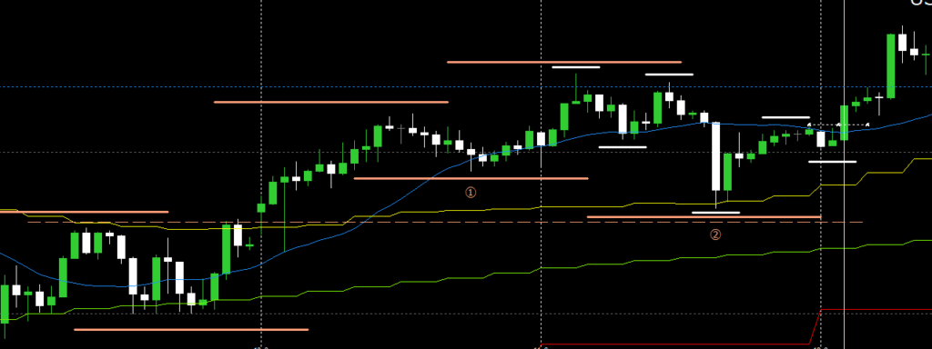 オレンジ①の調整がレジサポライン(オレンジ破線)まで戻って来ずに、次の調整(オレンジ②)でH4レジサポライン付近まで戻ってきた。