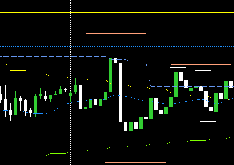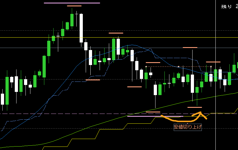 日足レジサポ(紫破線)のエリアまで押しをつけてきたところ。