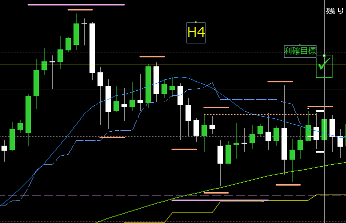 利確目標は、目立つH4高値の少し下(黄色水平線)にした。